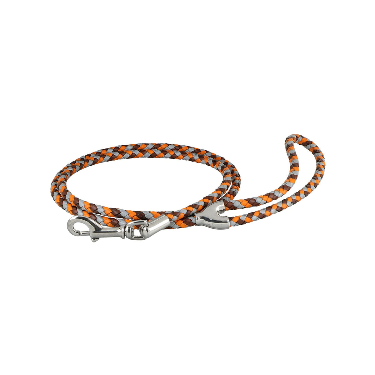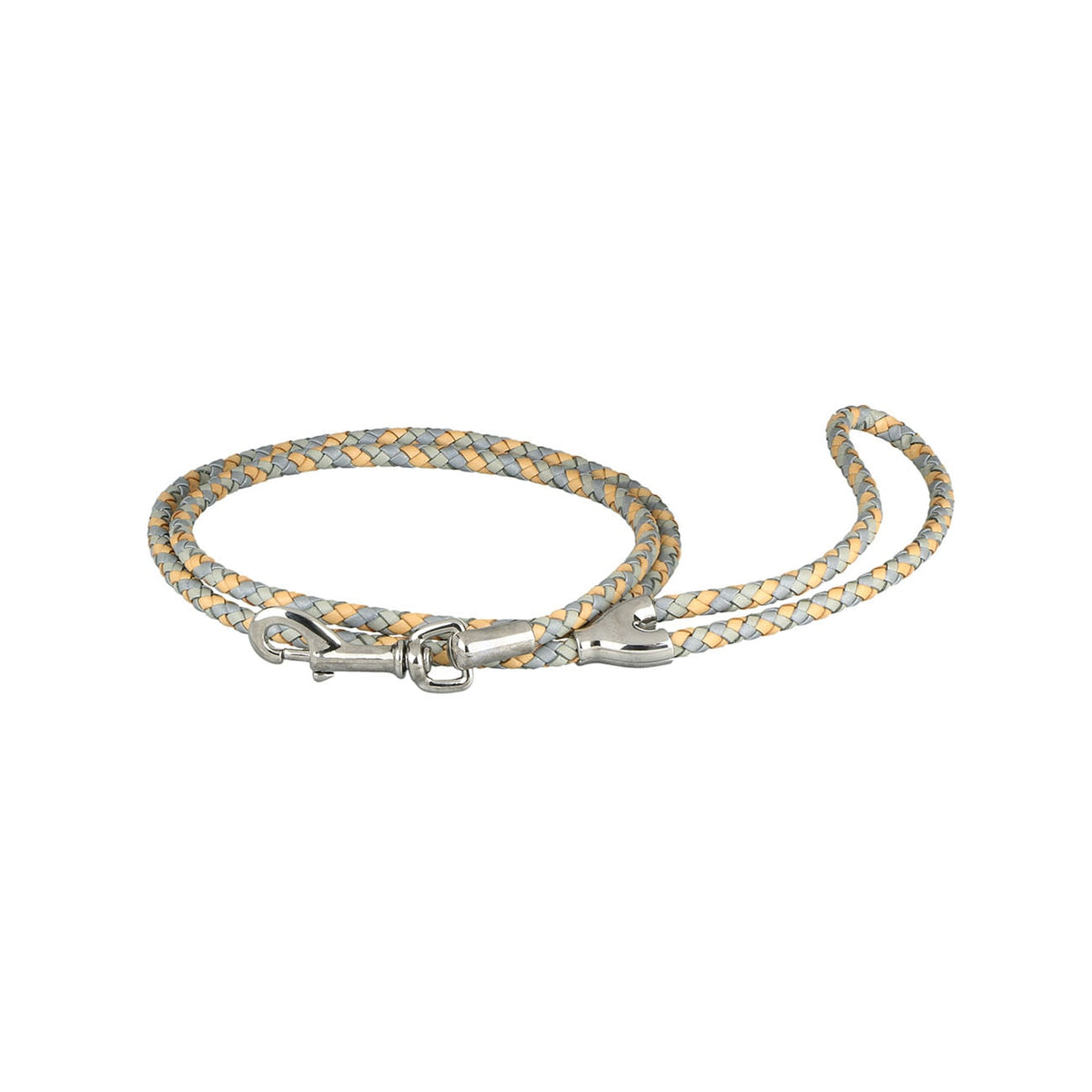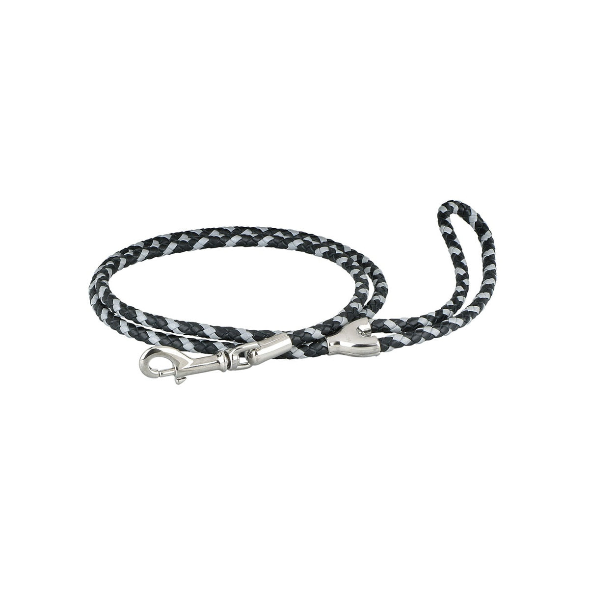 Very resistant leather and reflective fabric leash. It ensures greater visibility and safety by reflecting the light during dark hours. This item is wearable by small/medium dogs. All our leashes are 120 cm long.