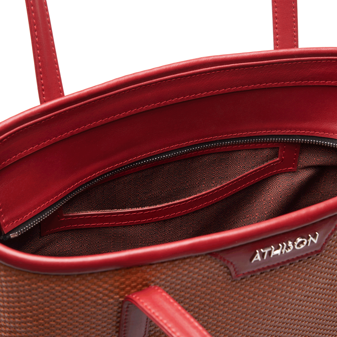 We have been always aware of the need to protect the environment and we are strongly committed to the sustainability of production techniques. This is why, for this line, we have chosen to use a leather obtained from production waste. Discarded leather pieces are “regenerated” with a special process and used again to give life to fine creations. Then the leather is finely cut into strips, dyed with water-based colors and finally braided with our exclusive looms using a viscose yarn that gives a natural brightness and compactness to the surface of the material.