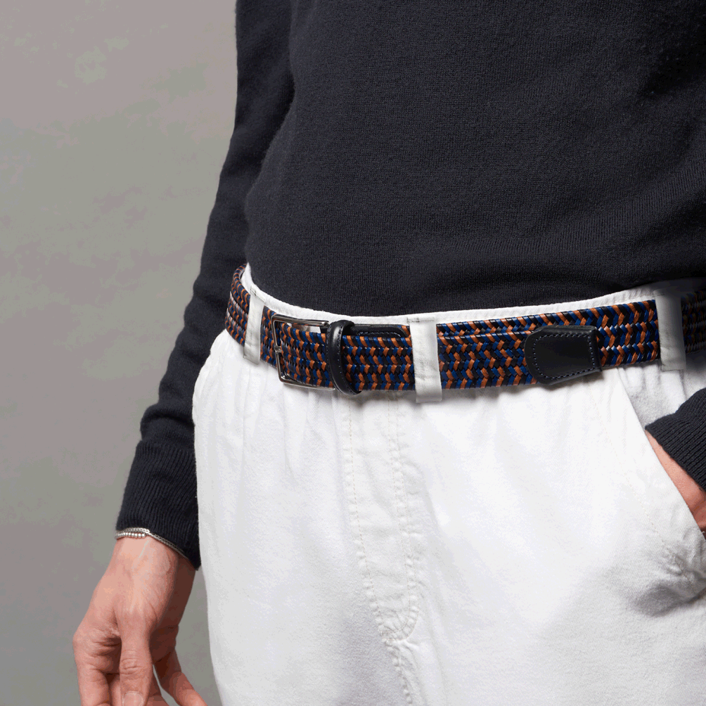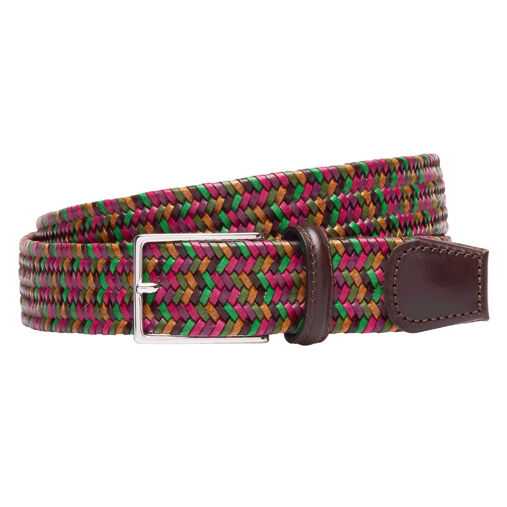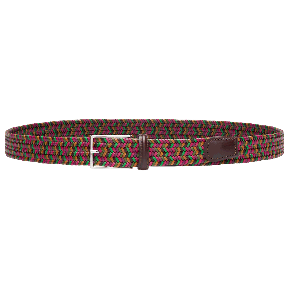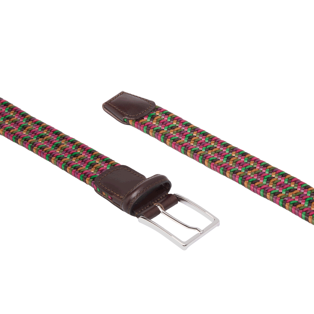 Braided elastic belt made of recycled leather. Offered in the Offered in multicolour version, this belt is a must-have for any look.