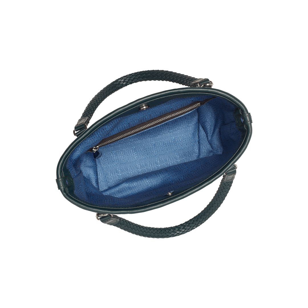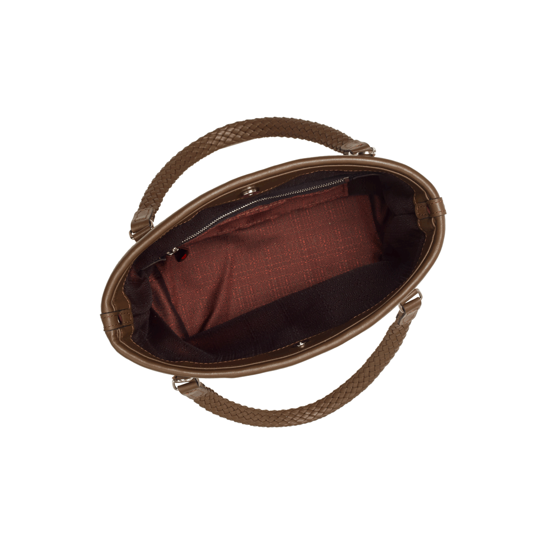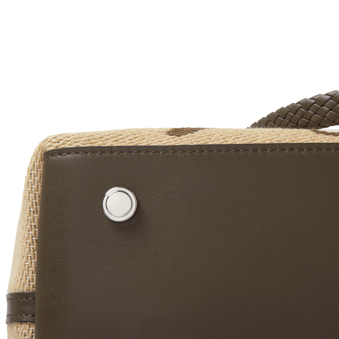 Features: woven leather handles, zip closure, shoulder strap, one internal zipped pocket, four brass feet