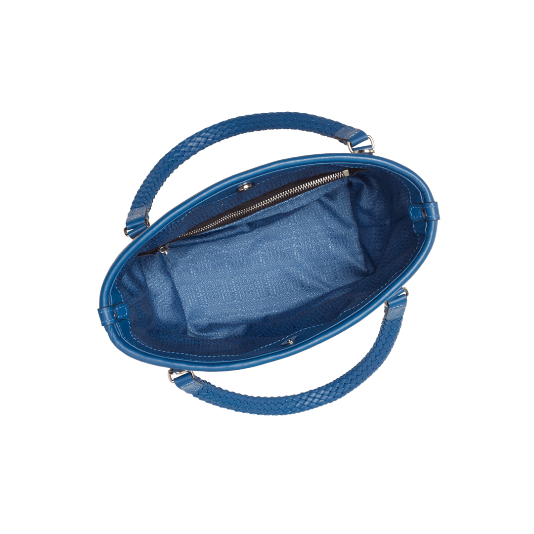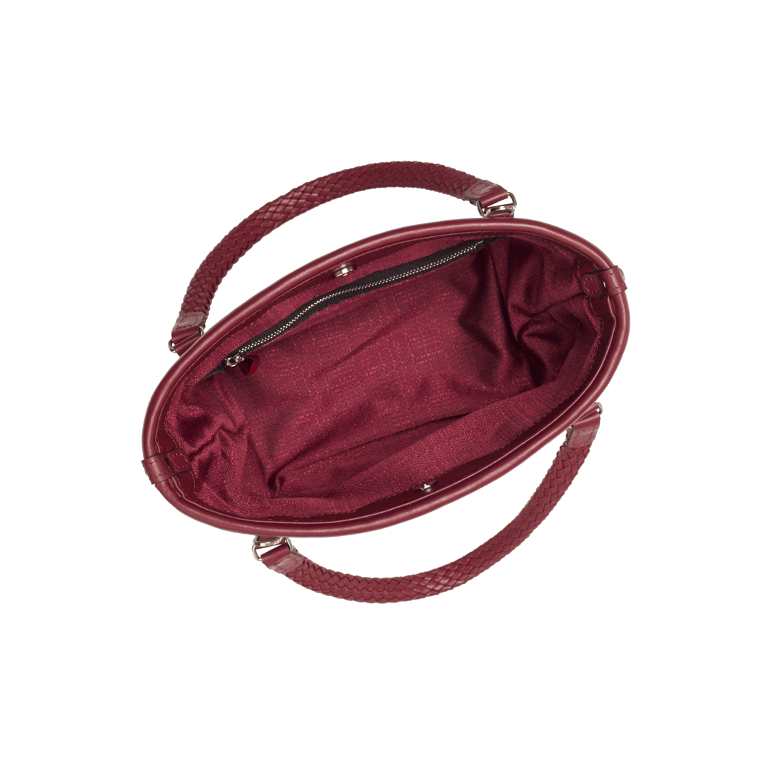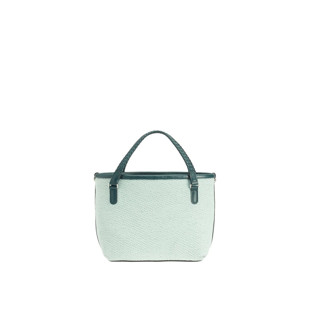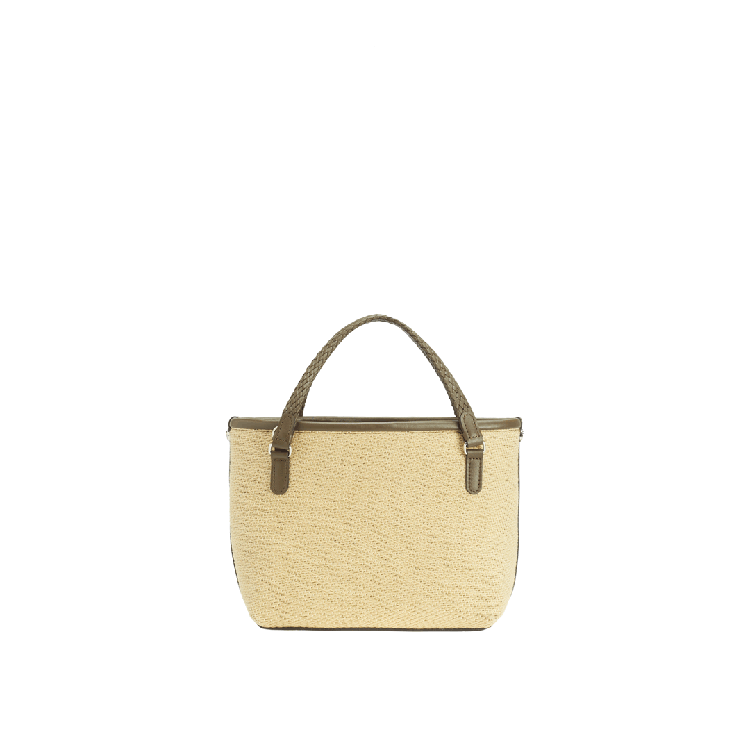 Features: woven leather handles, zip closure, shoulder strap, one internal zipped pocket, four brass feet