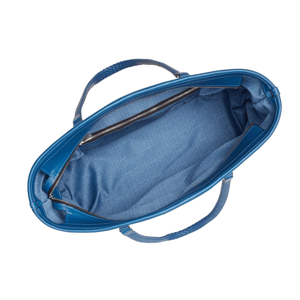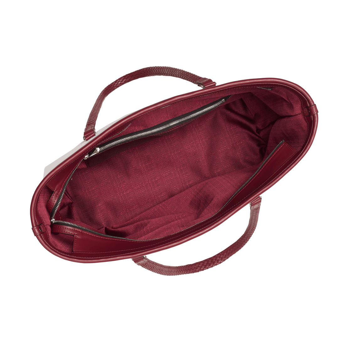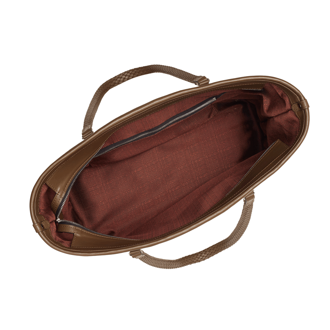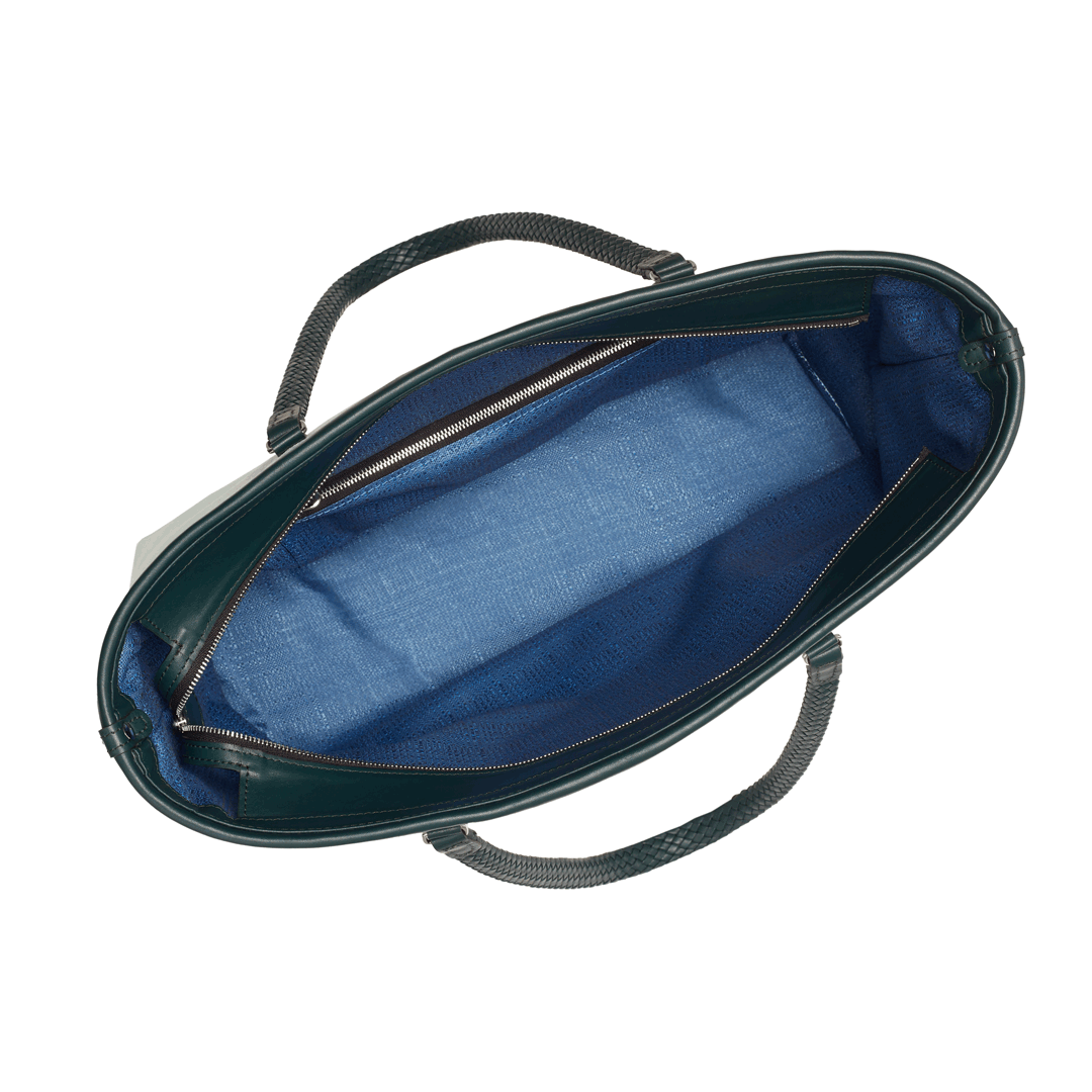 Features: Woven leather handles, zip closure, one internal zipped pocket, four brass feet.