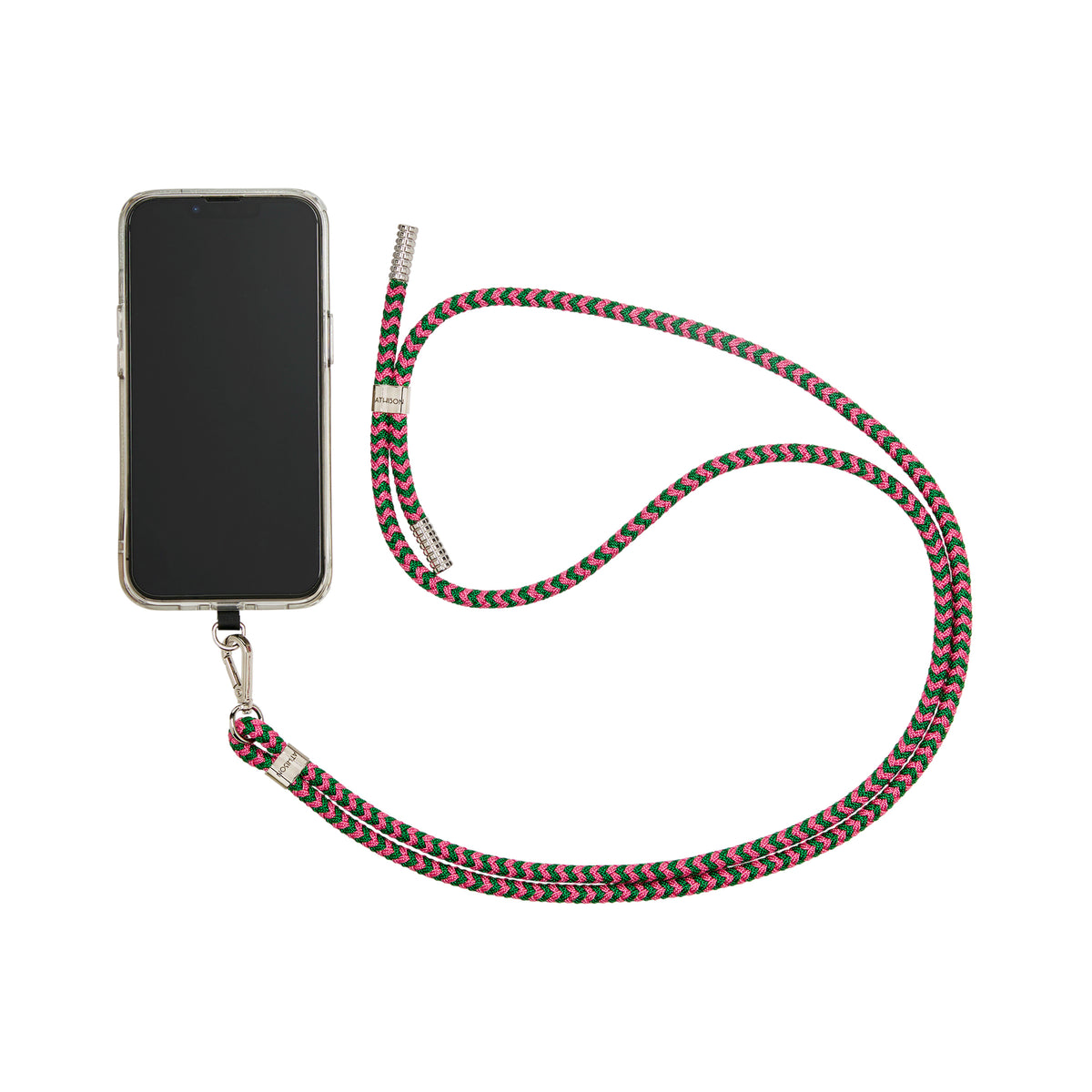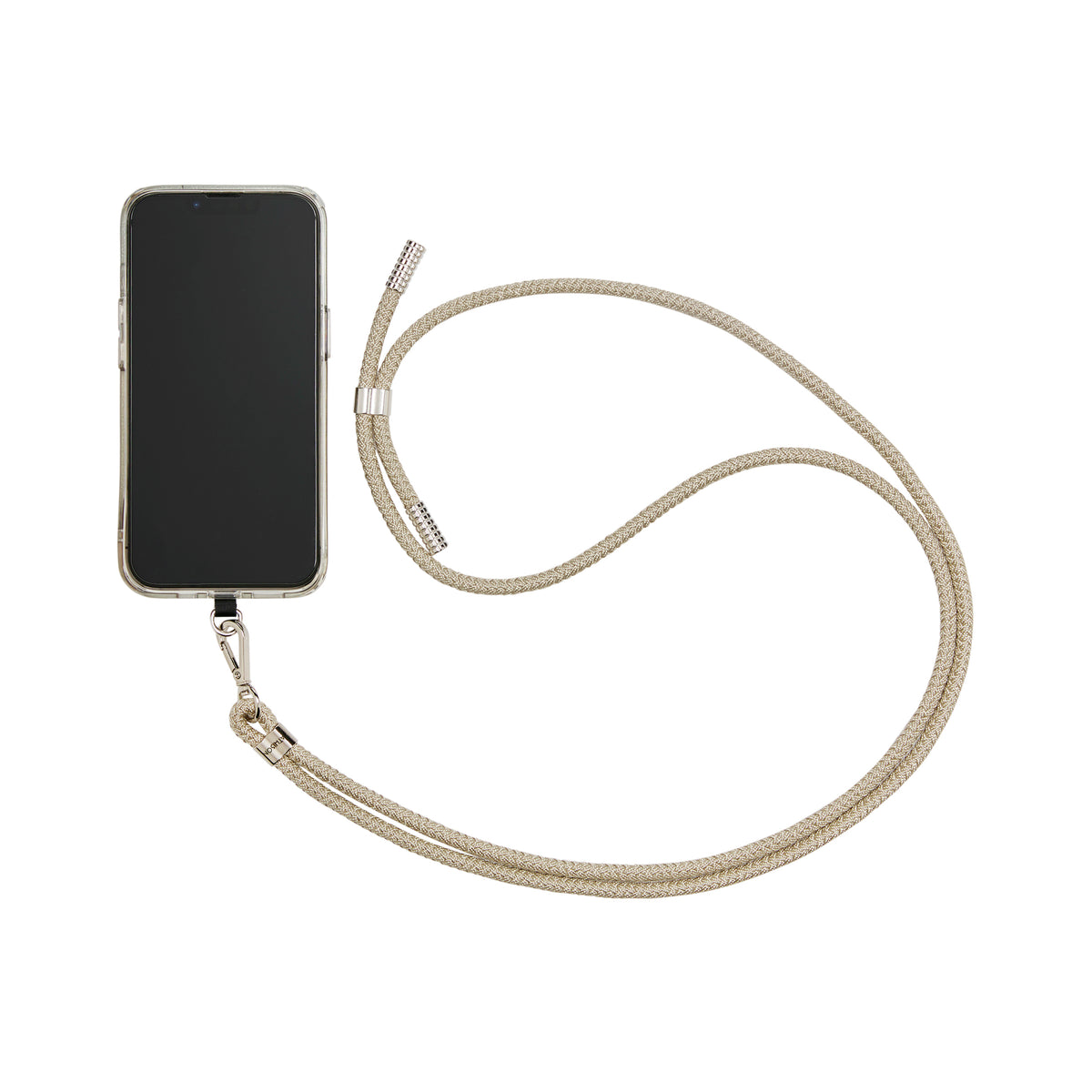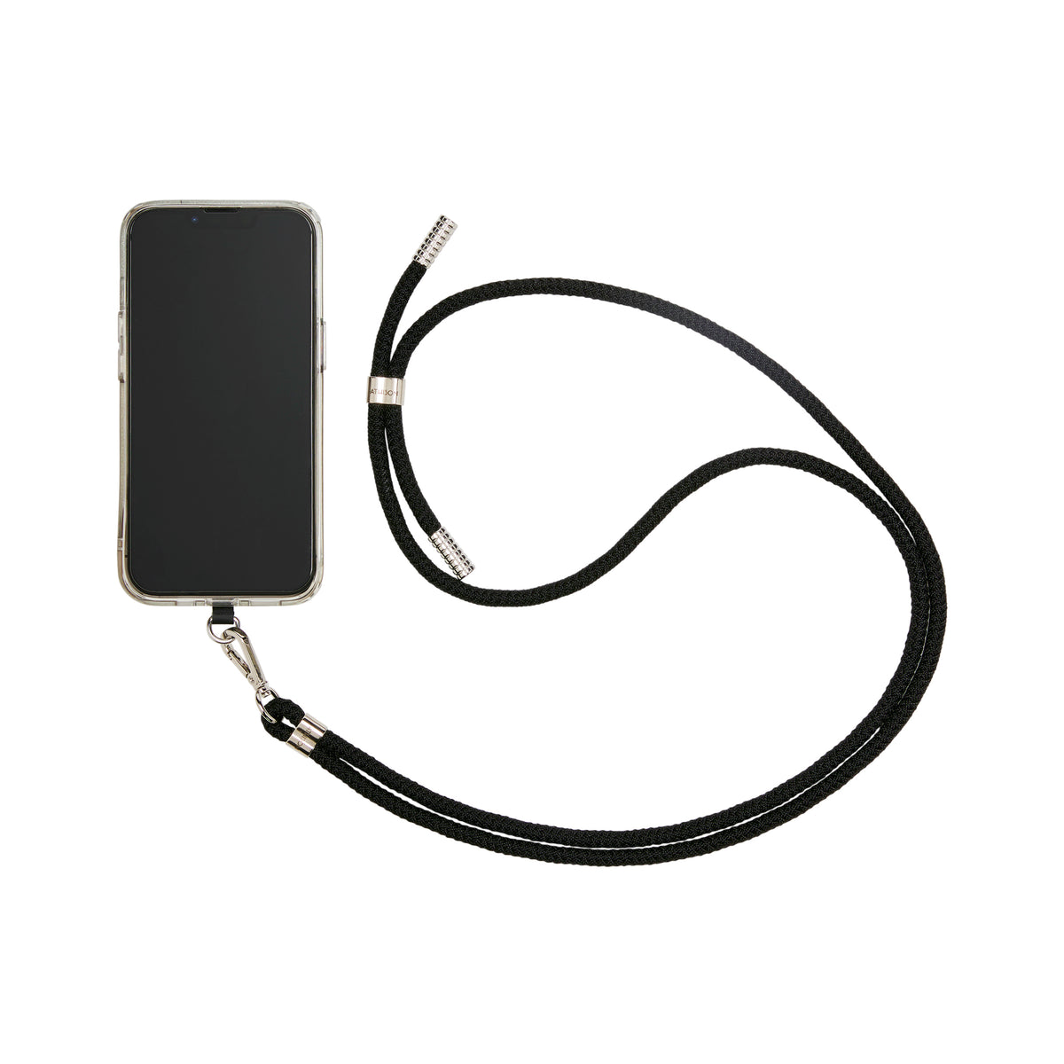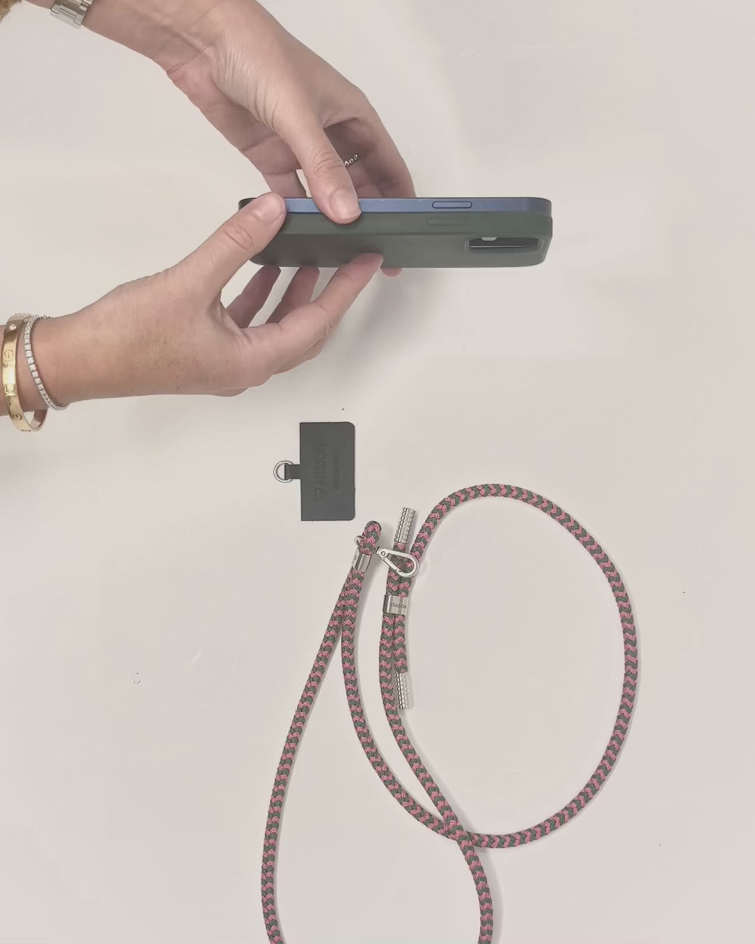 Practical and fashion cross body phone strap made of braided rayon. The shoulder strap is easily adjustable through the sliding of the metal rings. It’s compatible with every cover in the market thanks to the leather tab inserted into the cover and can be attached through the specific hook.