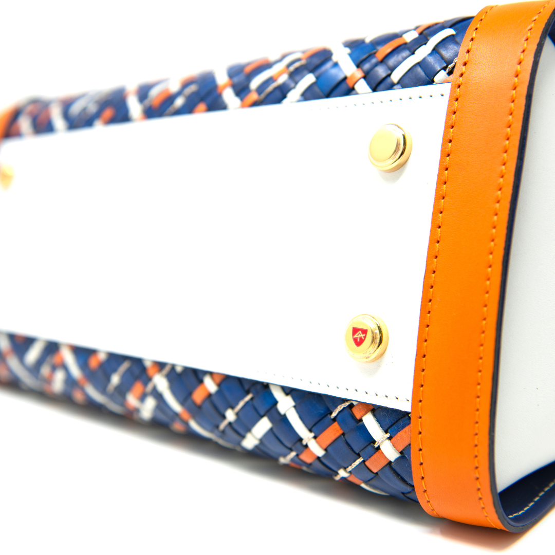 The material we use is the highest expression of the best vegetable-tanned leather skillfully processed by Tuscan suppliers. The bag is entirely produced in our plant. Leather is dyed using 100% non-toxic water-based colours and is cut into strips woven with thin copper wires on our exclusive looms. The production process is carried out by our expert technicians, paying the utmost attention and care to the smallest details.