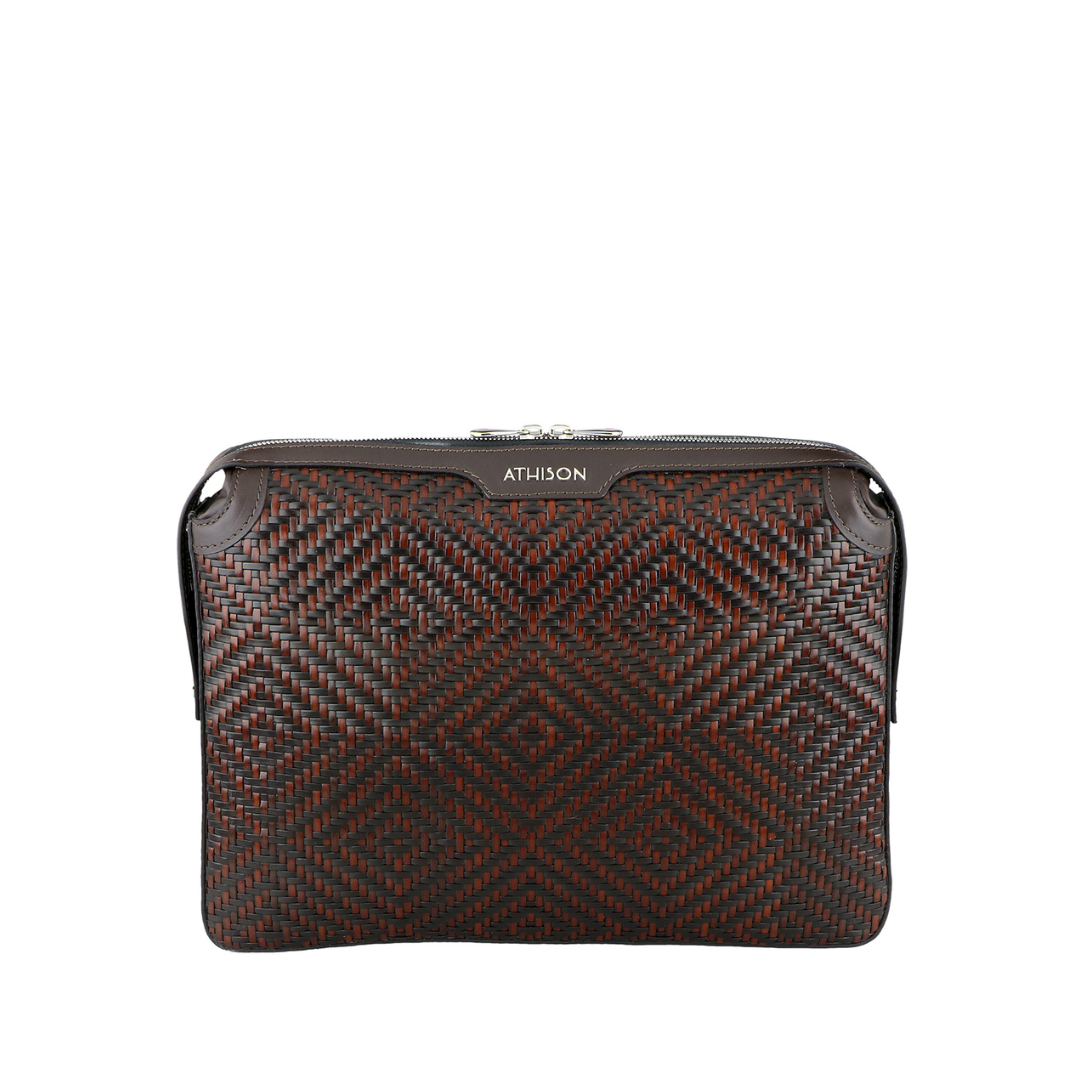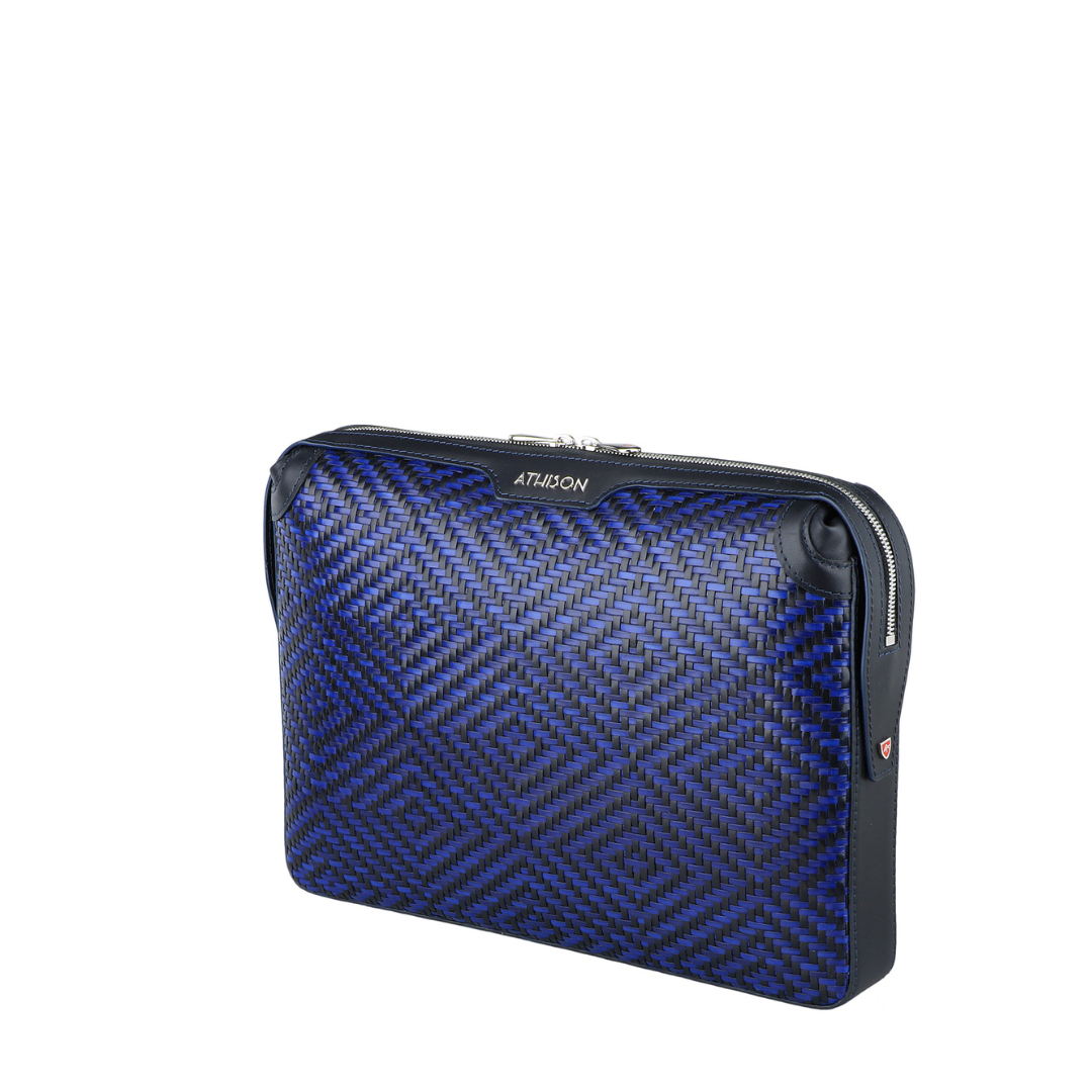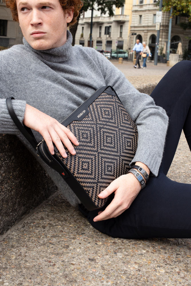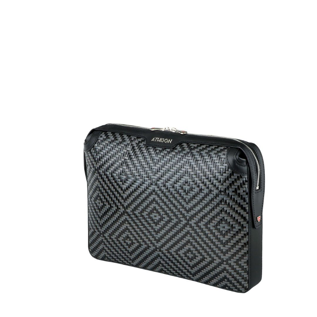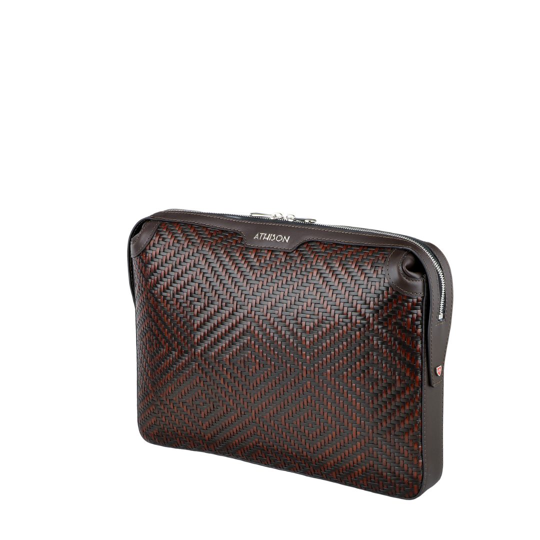 Elegant refined briefcase made of precious braided leather, with handle on the back and practical removable wrist strap.