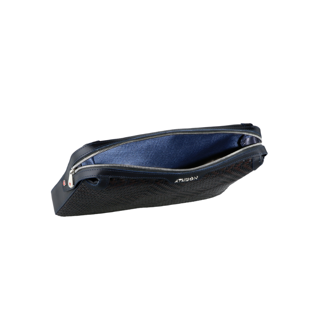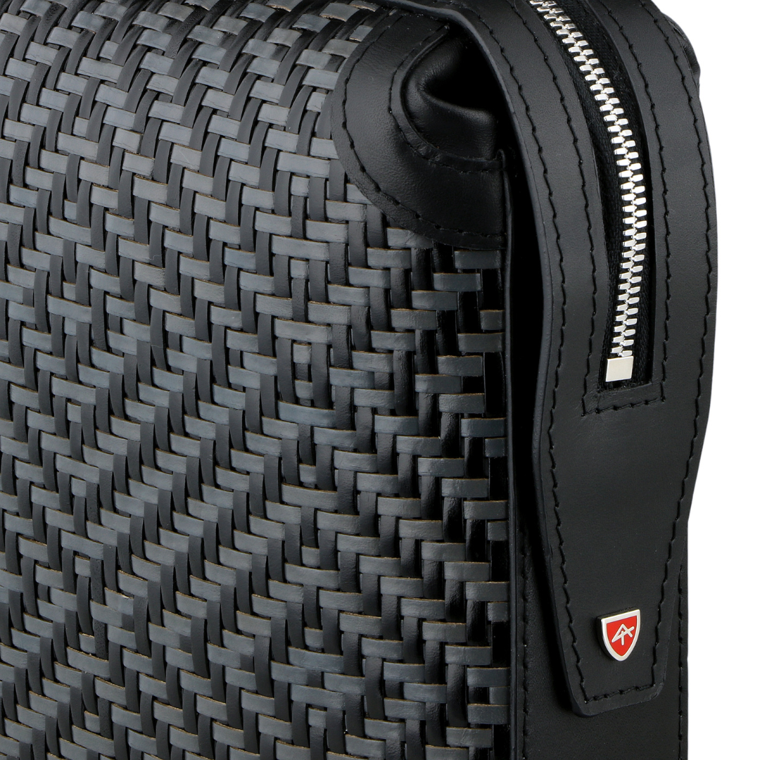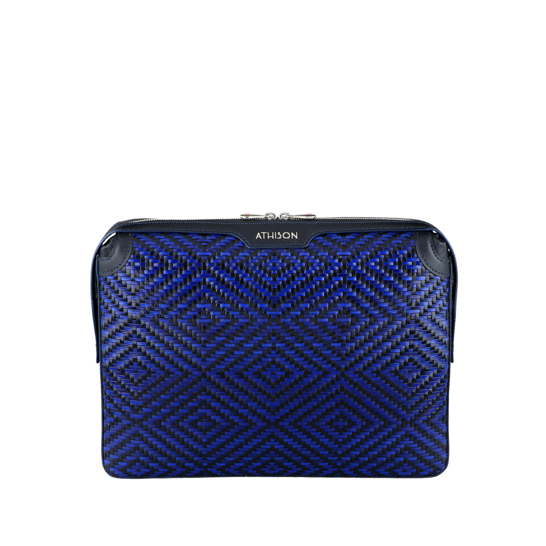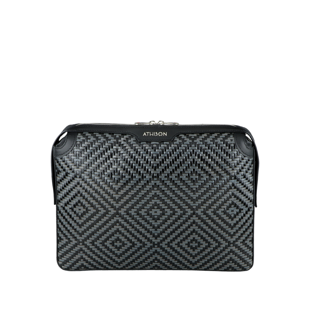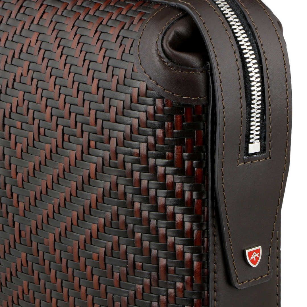 Elegant refined briefcase made of precious braided leather, with handle on the back and practical removable wrist strap.