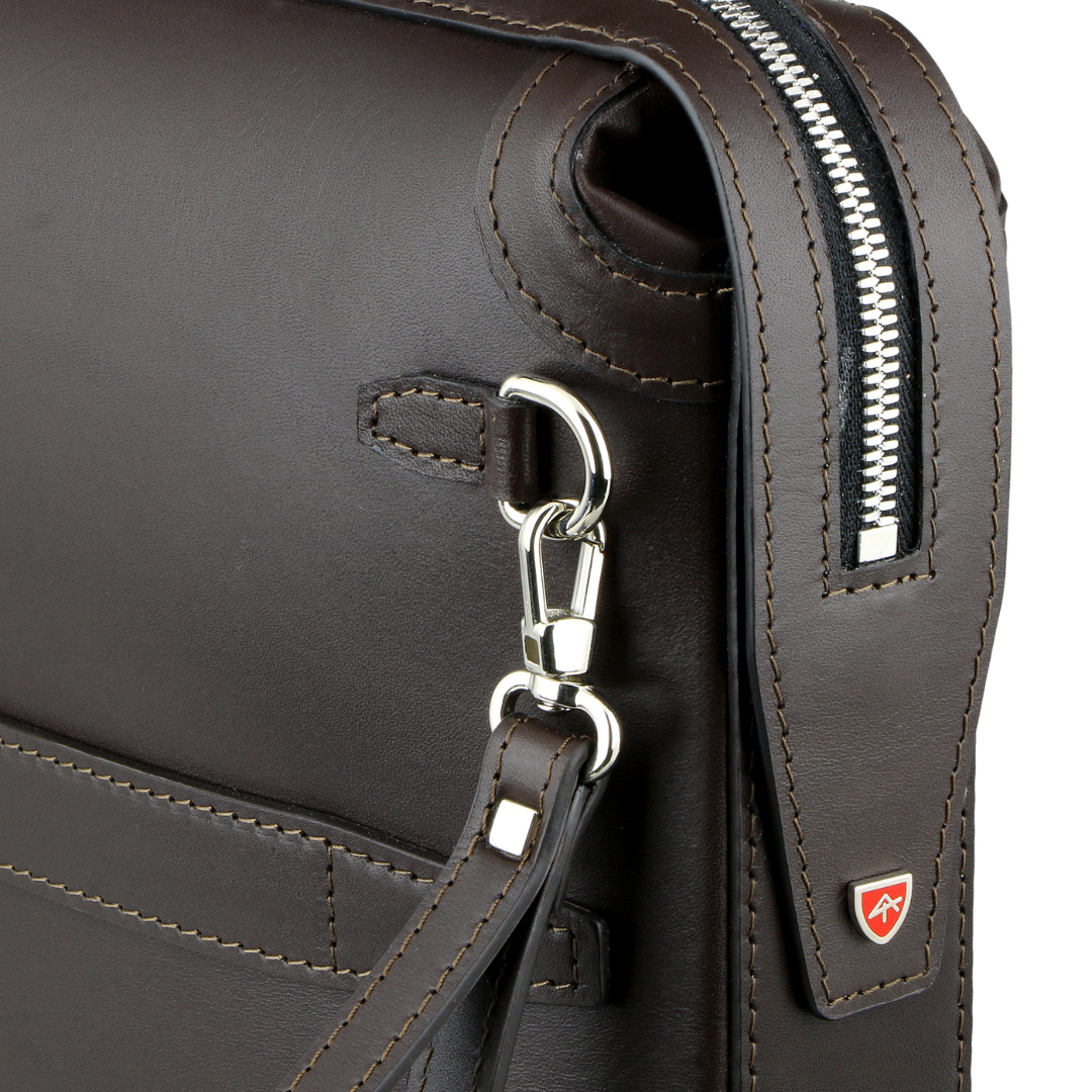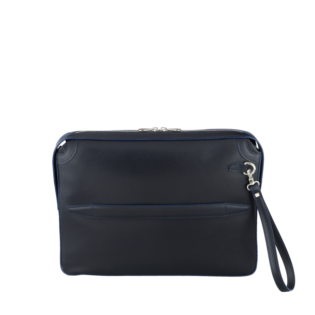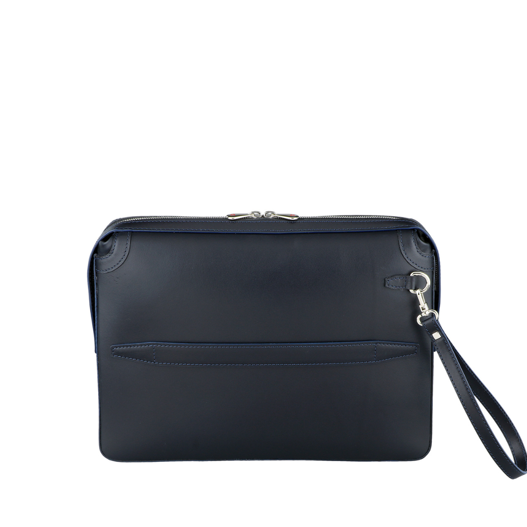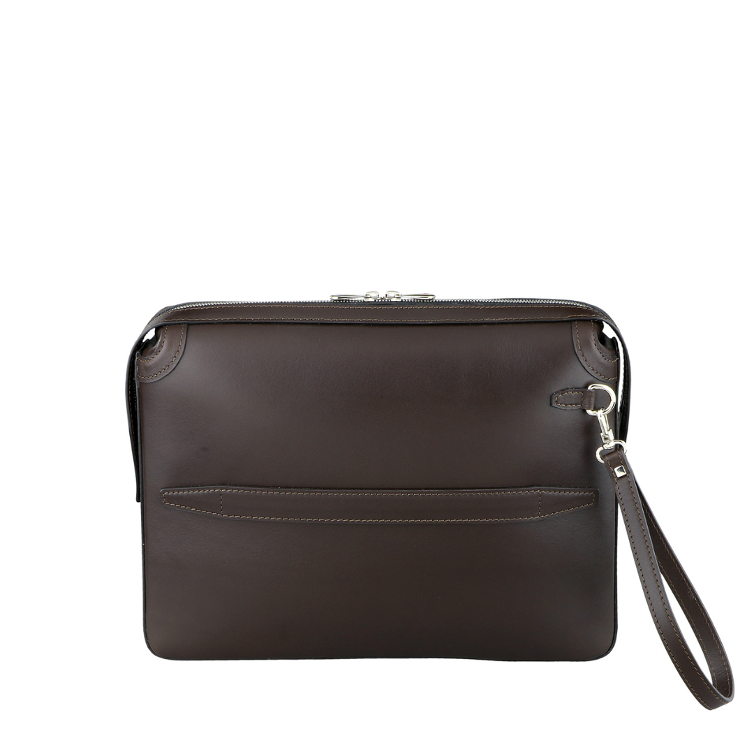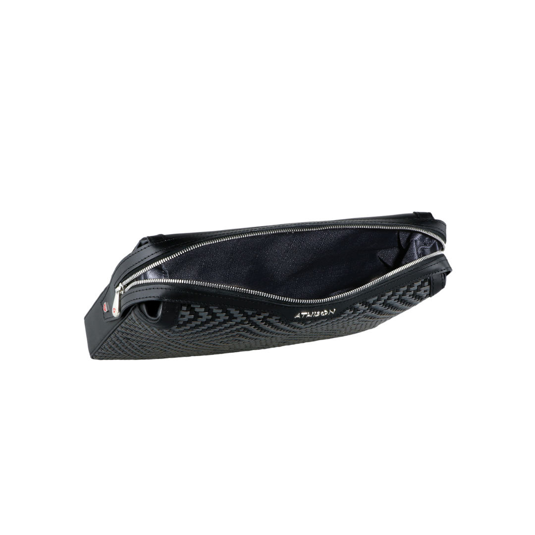 Elegant refined briefcase made of precious braided leather, with handle on the back and practical removable wrist strap.