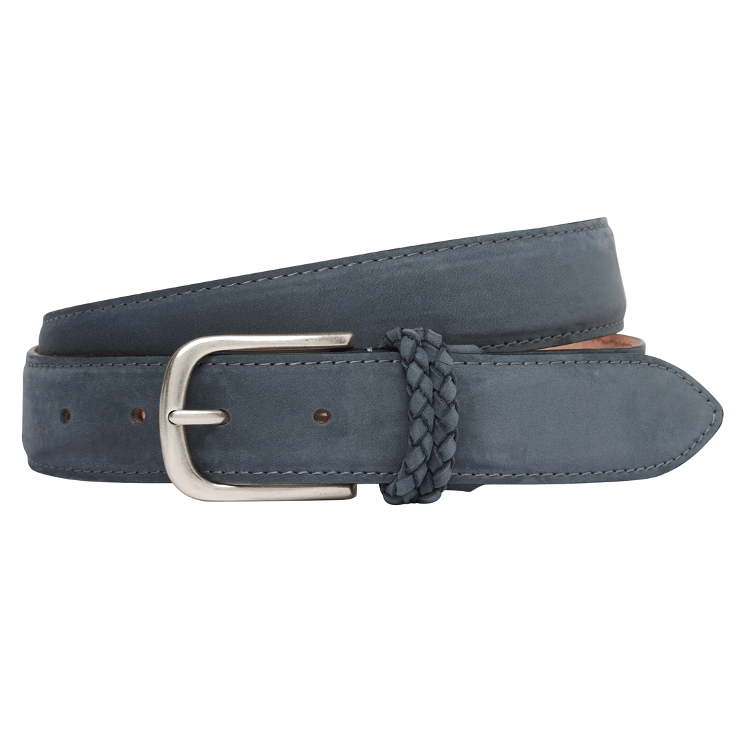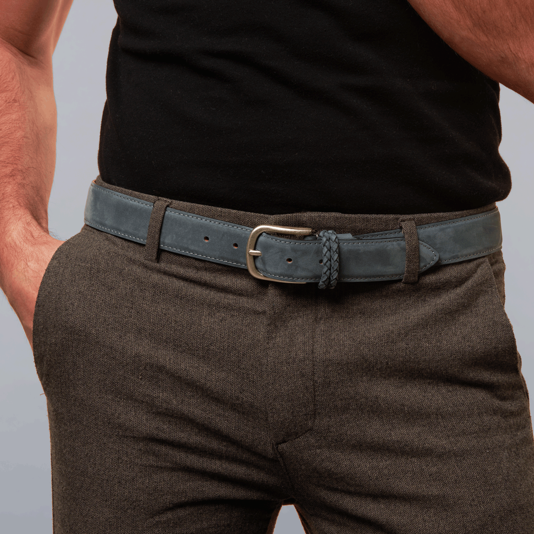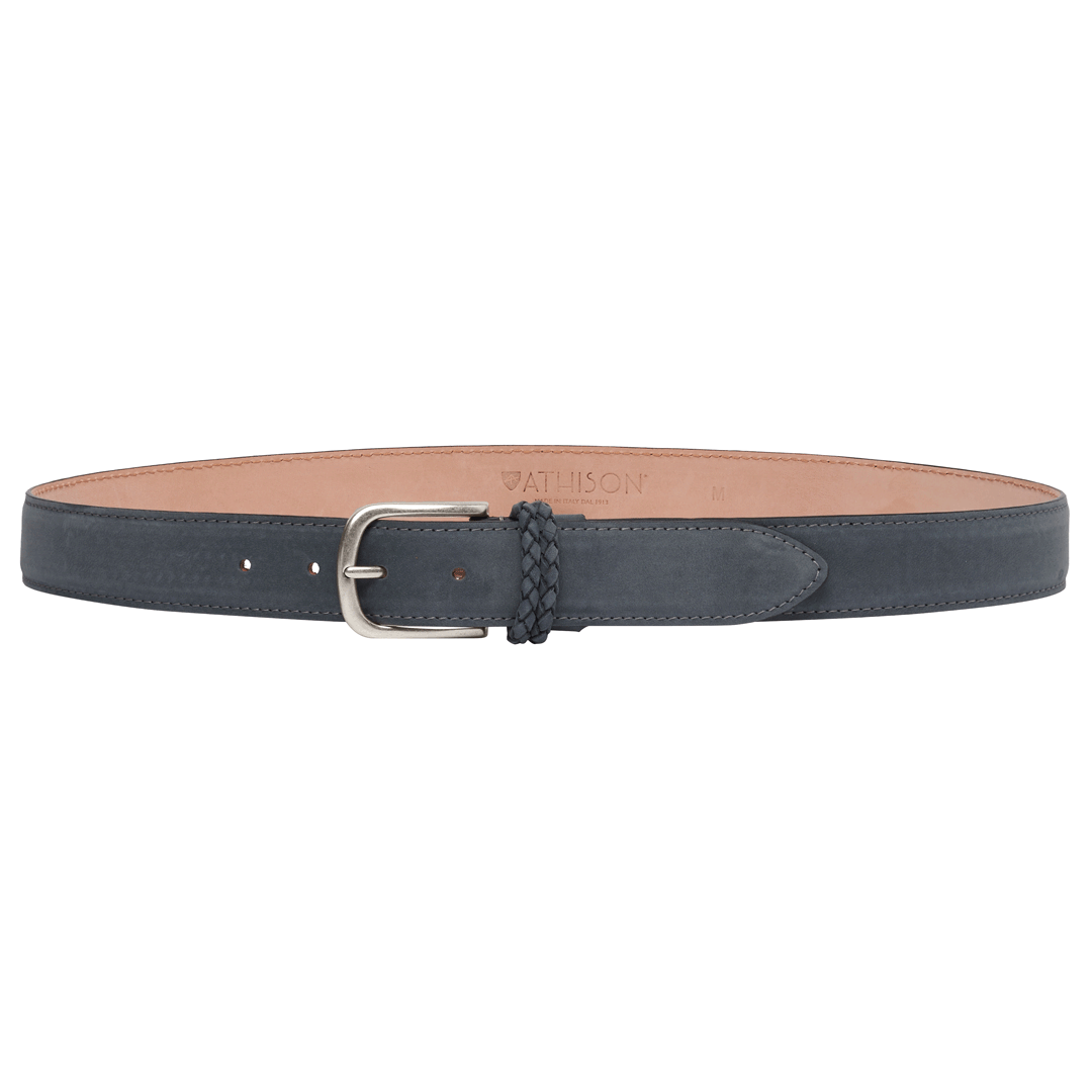 Crafted from premium nubuck, this belt is distinguished by a unique braided double loop and a functional buckle stop to adjust the size of the belt, all elegantly lined in fine natural leather.