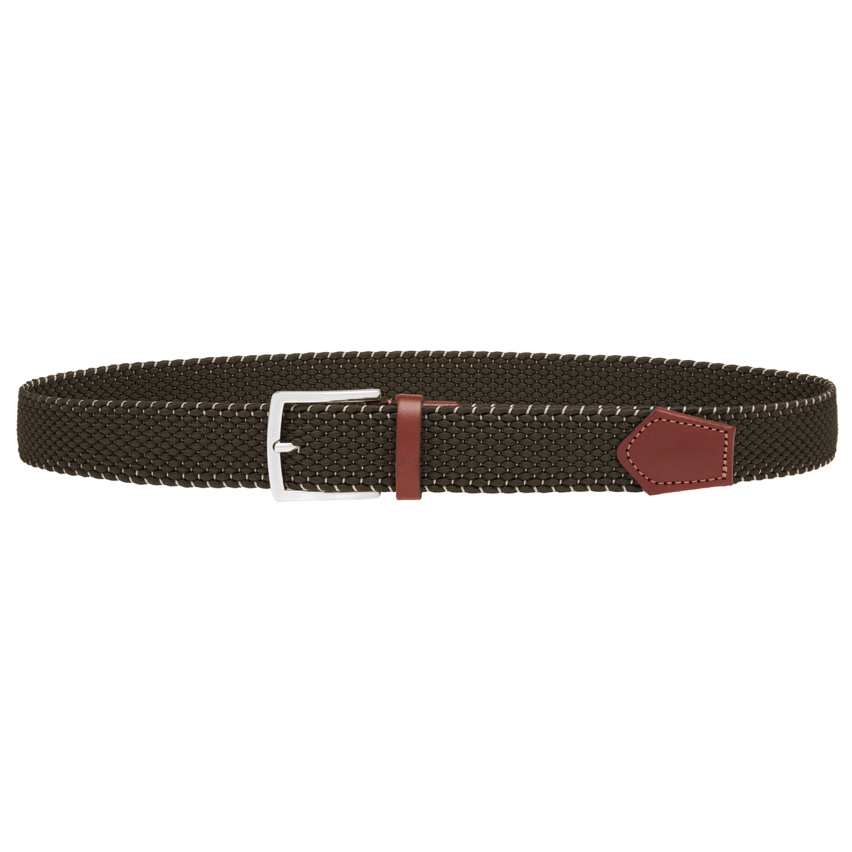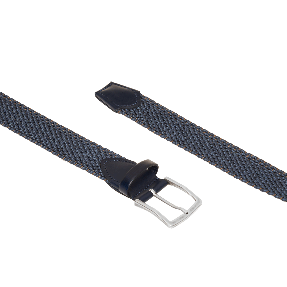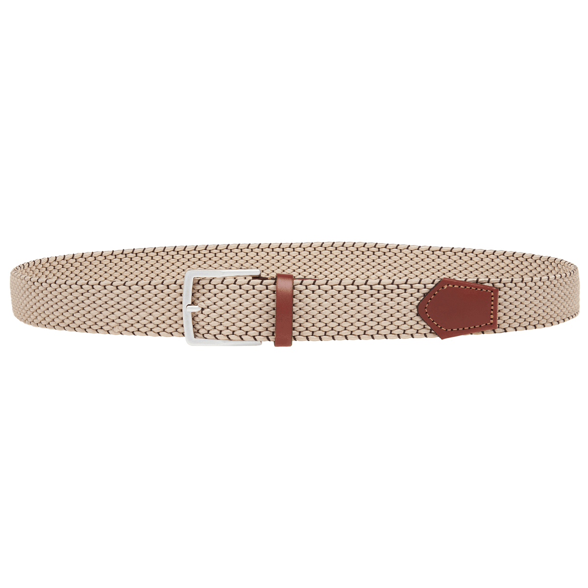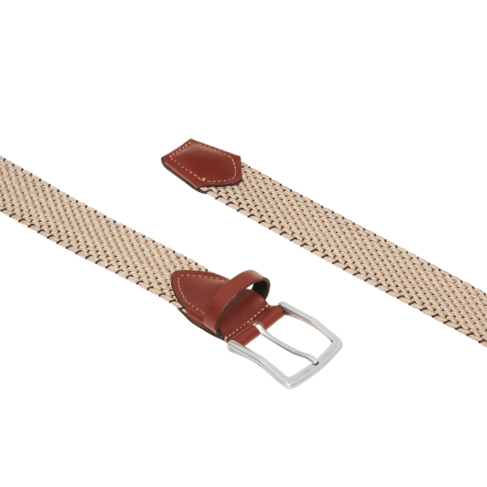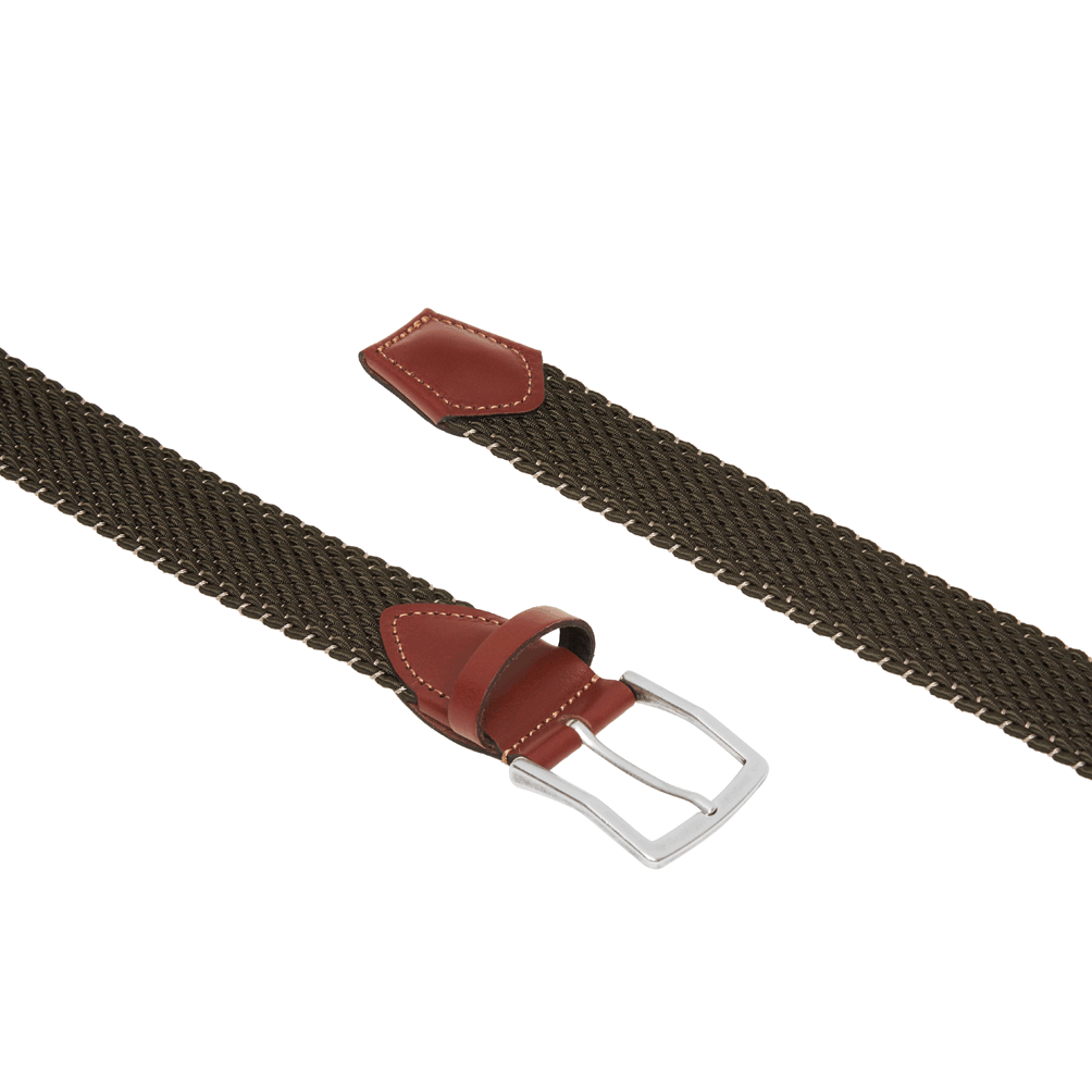 Stretch braided belt with ribbon style. Loop and tip of fine vegetable leather.