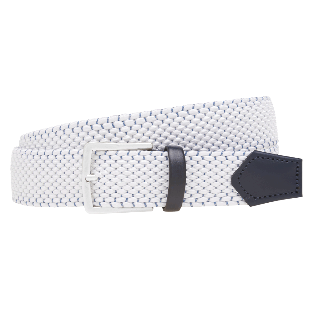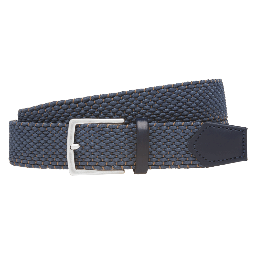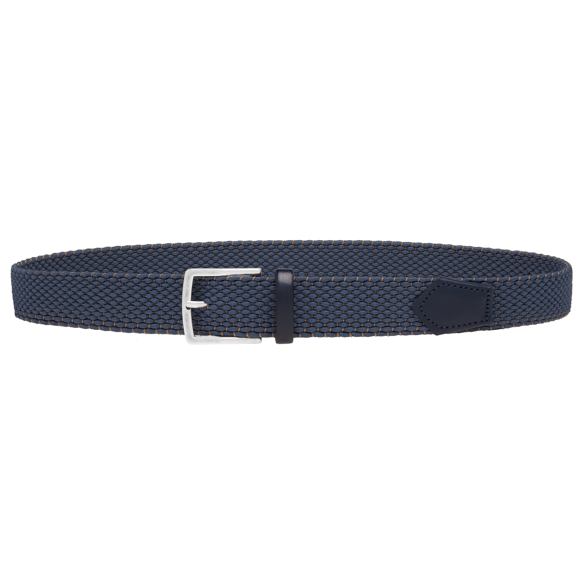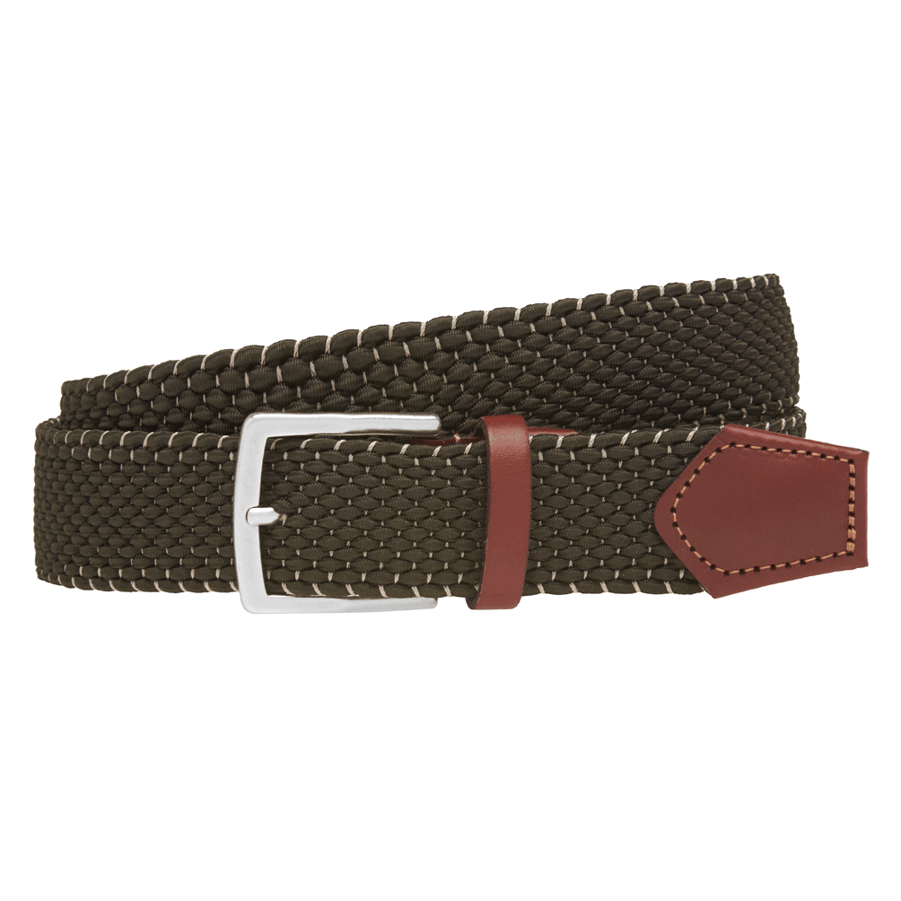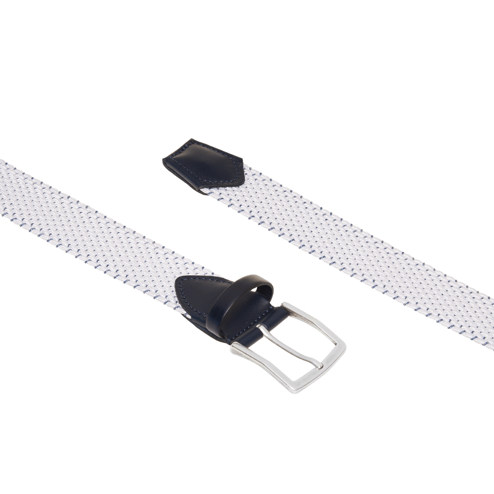 Stretch braided belt with ribbon style. Loop and tip of fine vegetable leather.