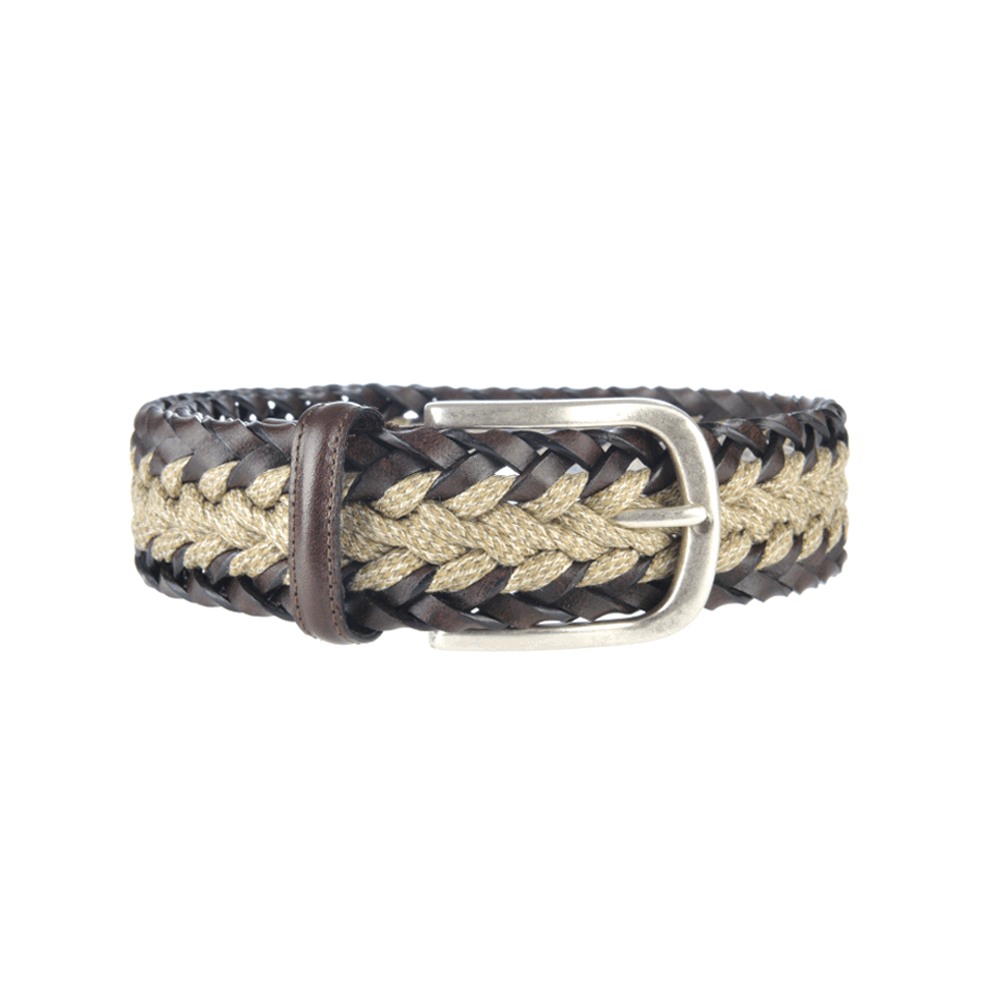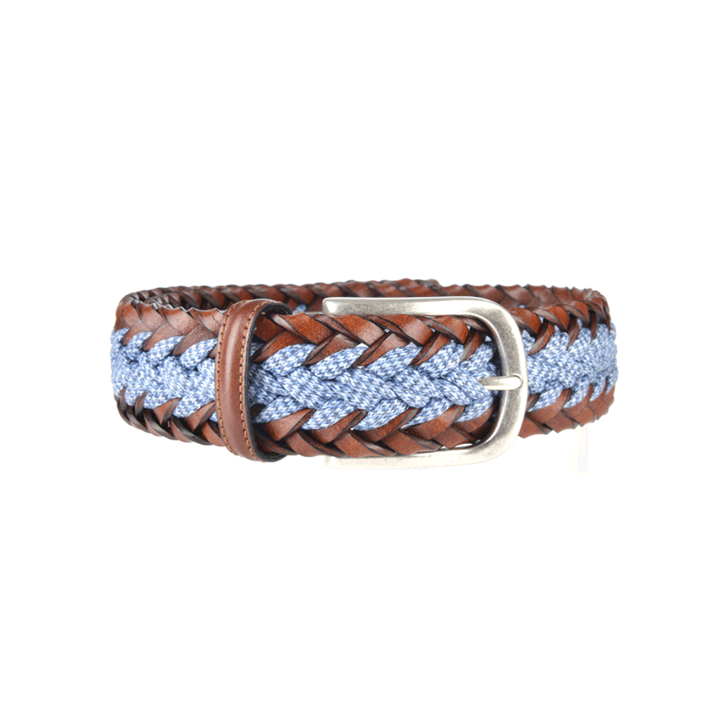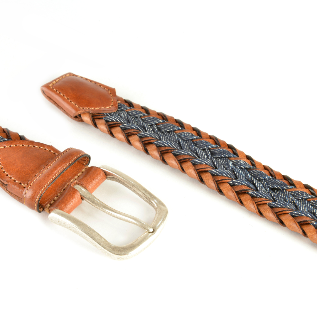 Cinturón trenzado en cuero regenerado y algodón/mezclilla. La combinación de dos materiales crea un artículo casual. Pasador y punta de cuero vegetal fino.