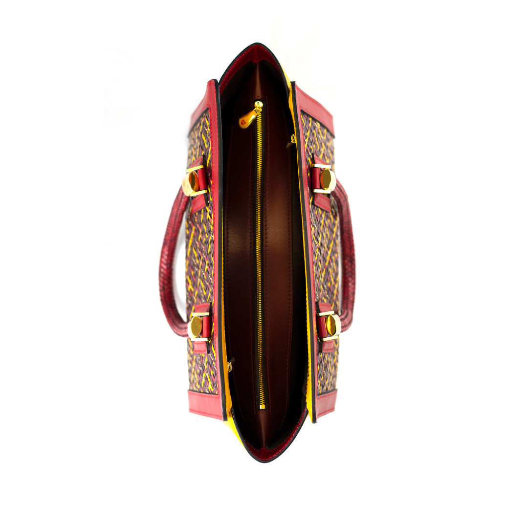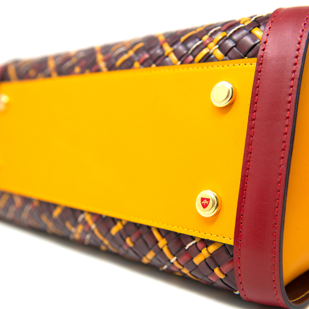 Le matériau que nous utilisons est la plus haute expression du meilleur cuir tanné végétalement, habilement travaillé par des fournisseurs toscans. Le sac est entièrement produit dans notre usine. Le cuir est teint avec des couleurs à base d'eau 100 % non toxiques et découpé en bandes tissées avec de fins fils de cuivre sur nos métiers exclusifs. Le processus de production est réalisé par nos techniciens experts, accordant la plus grande attention et soin aux moindres détails.